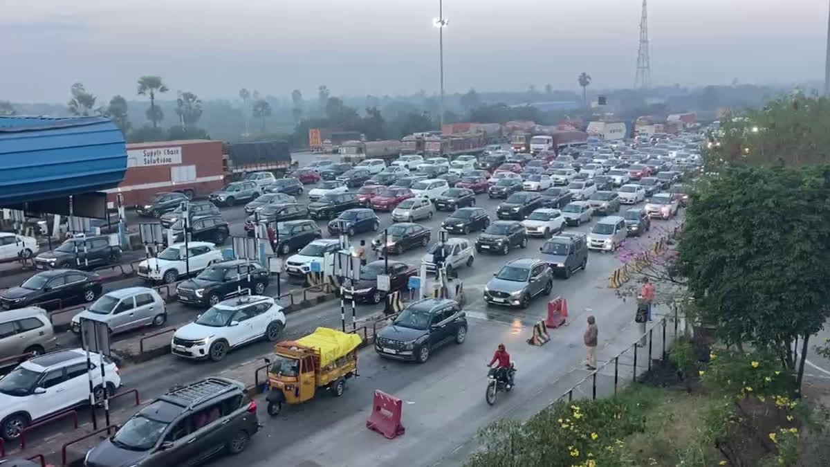 The roads witnessed a massive surge in vehicles. Officials say this situation is likely to continue for the next four to five days. At the Panthangi toll plaza in the Choutuppal area of Yadadri Bhuvanagiri district, approximately 21,000 vehicles passed between 12 AM on Friday and 8 AM on Saturday. Another 22,000 vehicles passed through between 8 AM and 4 PM on Saturday. This figure represents approximately 2,700 vehicles per hour.