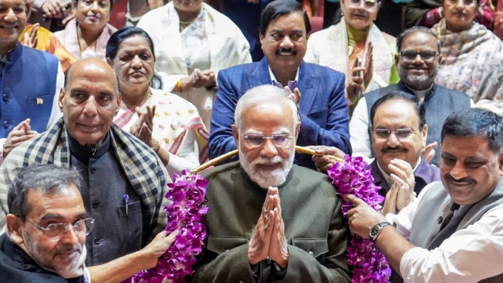 Leader Sanjay Jha of the Janata Dal (United) and Upendra Kushwaha, President of the Rashtriya Lok Morcha, honored Prime Minister Narendra Modi by garlanding him. Earlier on Monday, a delegation of NDA leaders from Bihar met with PM Modi and congratulated him on the alliance’s landslide victory in the state elections. PM Modi said that Nitish Kumar was the architect of the Bihar victory.