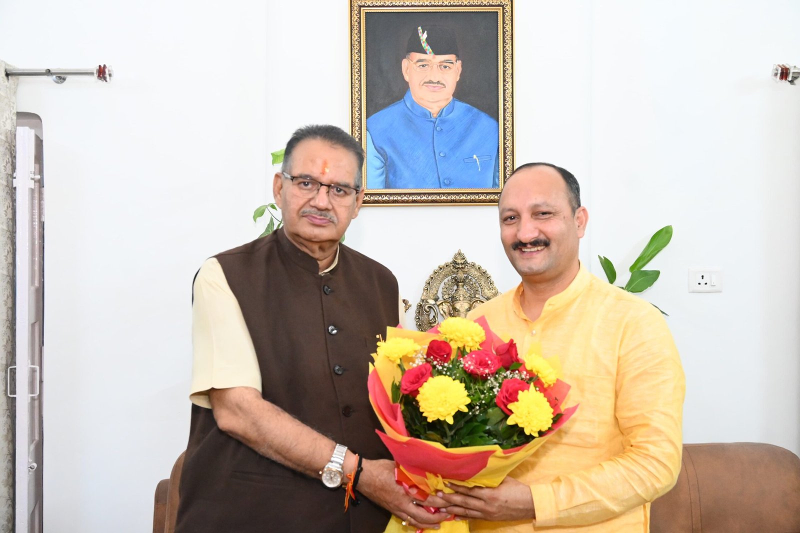 The newly elected District Panchayat President of Uttarkashi, Ramesh Chauhan, met the Agriculture Minister of the state, Ganesh Joshi, at his official residence today. During this, Minister Joshi congratulated Ramesh Chauhan on being elected as the District Panchayat President and wished him a successful tenure.